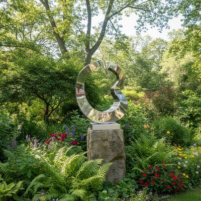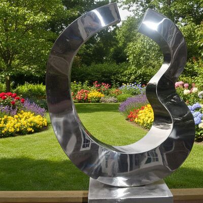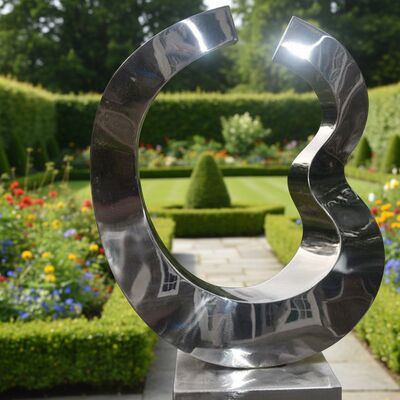Deze hedendaagse sculptuur heeft een vloeiende, abstracte vorm gemaakt van hoogwaardig gepolijst roestvrij staal.Het maakt het een opvallend middelpunt voor elke tuin., gazon, of landschap.